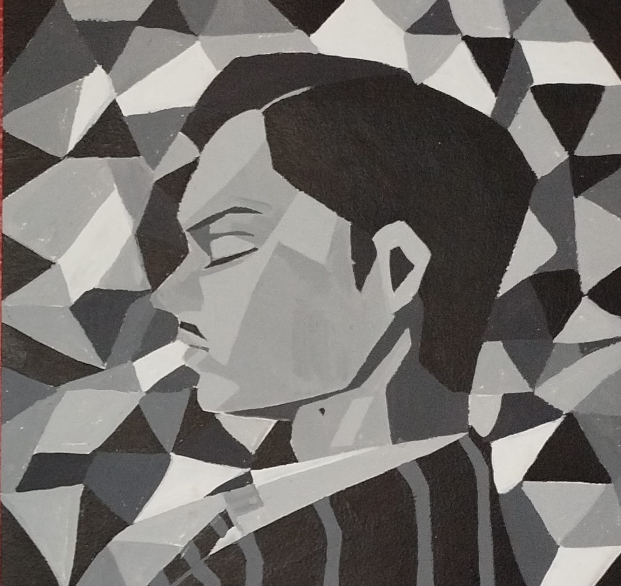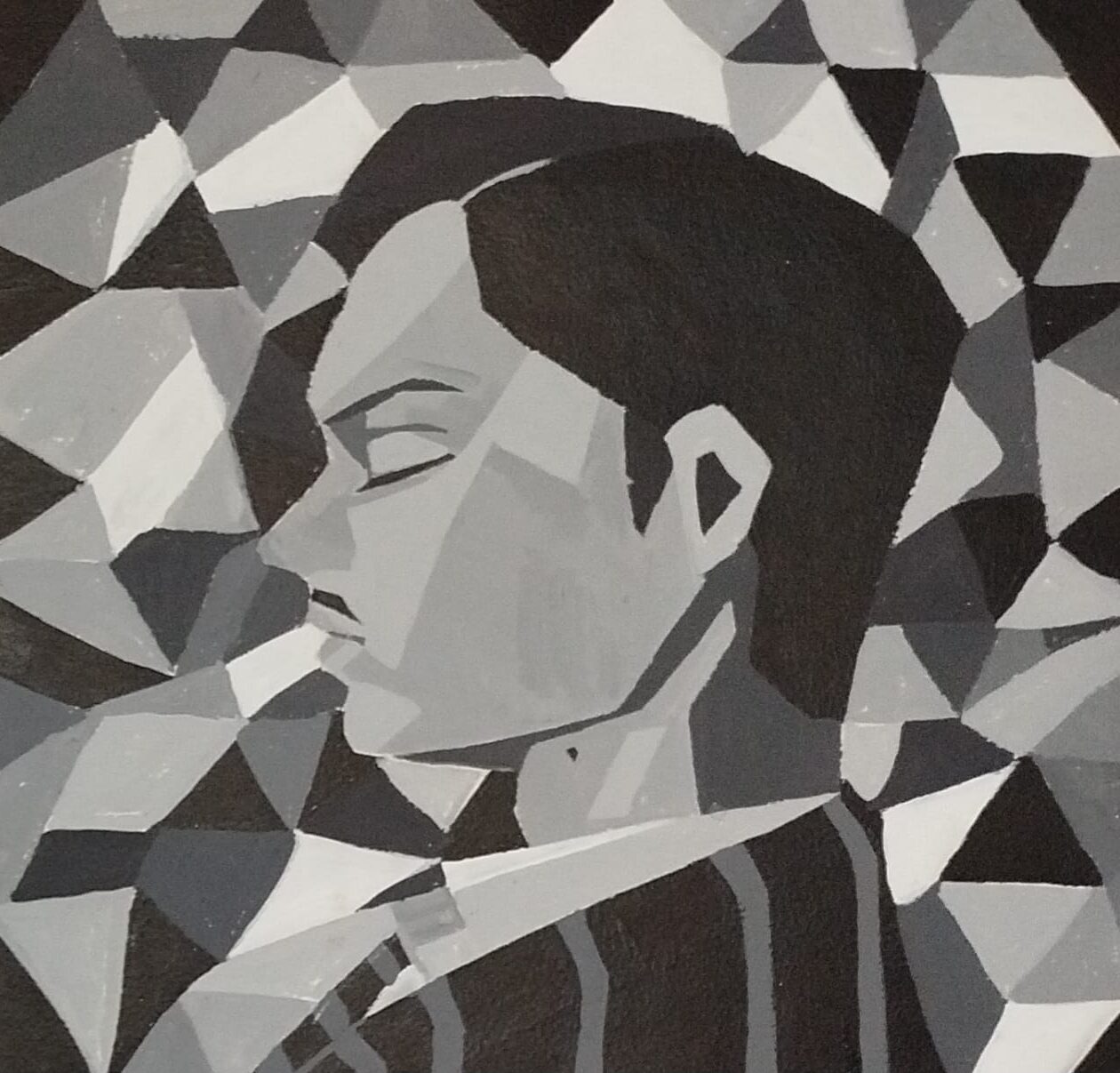 Ilustración tradicional en acrílico en estilo cubismo del personaje interpretado por Evan Peters en American Horror Story.